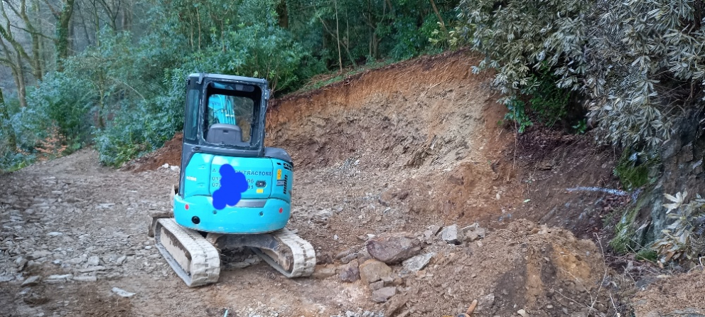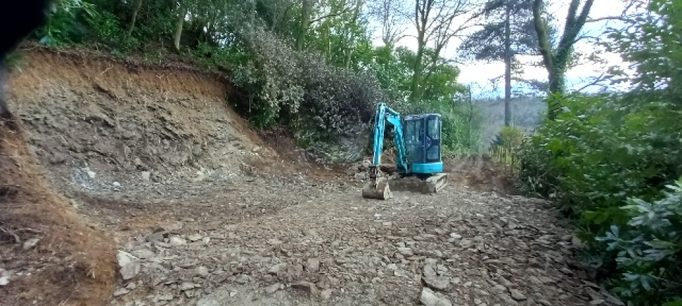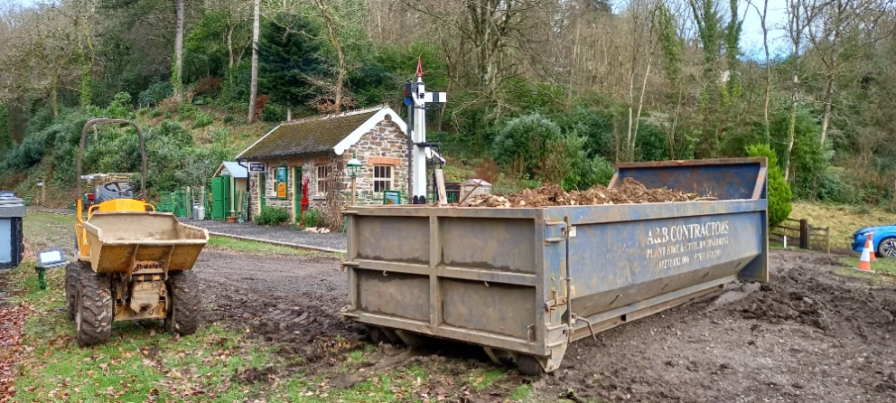 The work underway is high up at the former summerhouse site to dig out a larger area for the new lodge as per the agreed planning permission. The old derelict summerhouse was disposed of and the contractors dumper has been moving spoil from here down to the skips for removal off site.