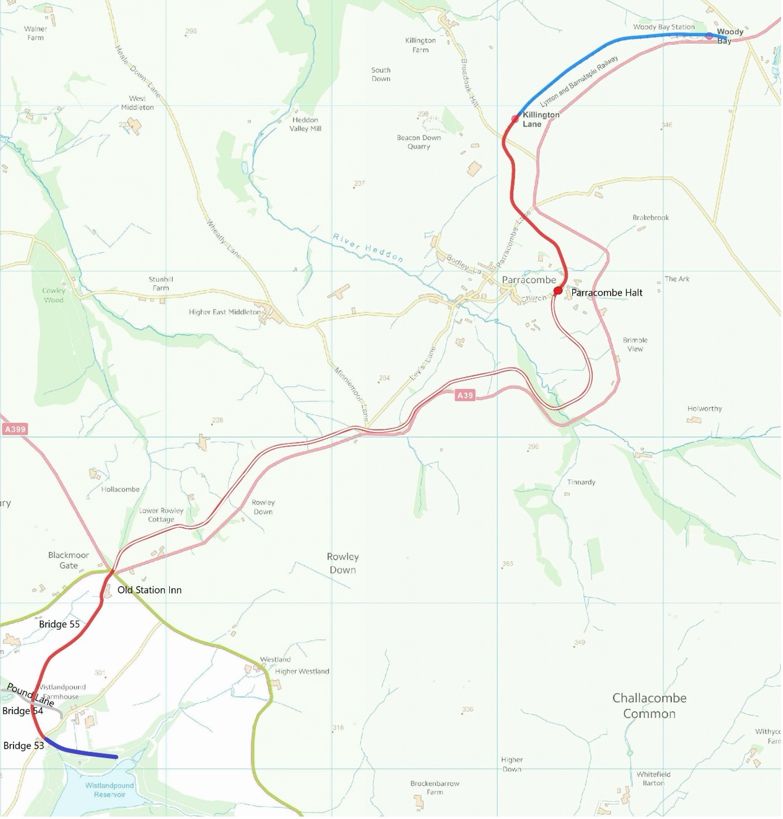 A hardcore access route is currently being laid from Old Station Inn towards Bridge 55 that will be used for future construction access. In the interim it may open as a walking route from Old Station Inn as far as Bridge 54, where the public bridleway known as Pound Lane provides a link to the Calvert Trust site and onward to Wistlandpound reservoir. Sufficient land has been fenced to accommodate a permanent path parallel with the railway when fully reinstated.