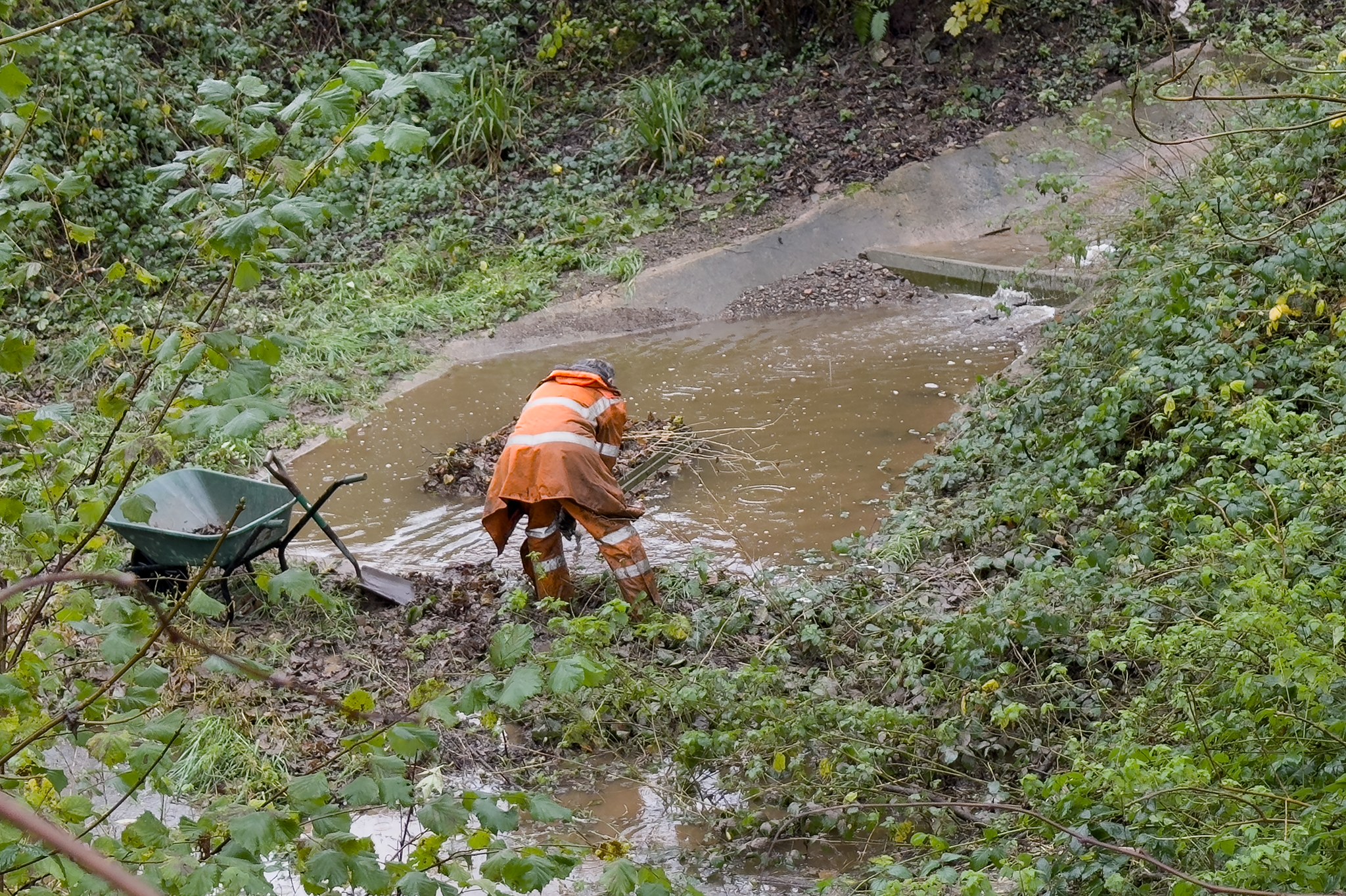 An additional highway drain which had been blocked on a number of occasions, defected to Devon Highways and attended to by them previously was found to be blocked. This drain runs into an open pit at the top of the overflow car park, then underground and is culverted under the railway. Volunteers eventually cleared this drain and traffic was able to pass safely.